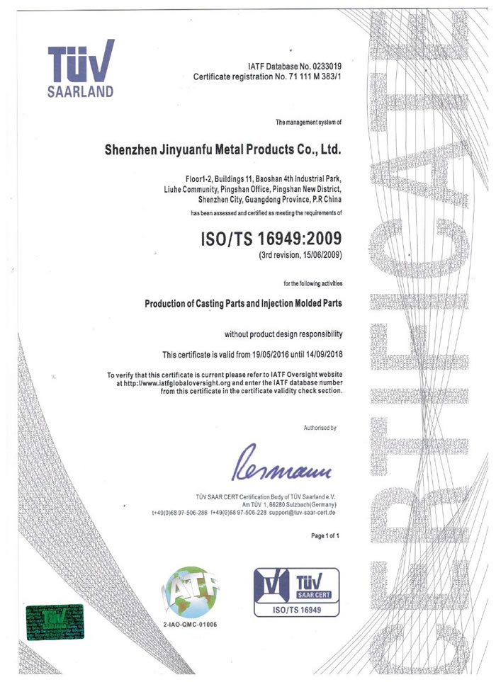 深圳市金源福五金制品有限公司成立于2003年。公司擁有8000多平方米生產(chǎn)廠地、開發(fā)與管理精英人才、技術(shù)專業(yè)、設(shè)備精良、交通便利、服務(wù)周全、具體設(shè)計、開發(fā)、制模、出樣、生產(chǎn)到成品出貨一體化模式生產(chǎn)廠家。已通過ISO9001:2008ISO1440/TS16949:2009國際質(zhì)量體系認(rèn)證。專業(yè)生產(chǎn)鋅合金壓鑄、鋁合金壓鑄產(chǎn)品、汽車配件、汽車后視鏡支架、車載導(dǎo)航散熱器、LED散熱器、LED燈罩、數(shù)碼電子五金結(jié)構(gòu)件、家具五金裝飾件、標(biāo)牌(LOGO)等五金壓鑄產(chǎn)品。